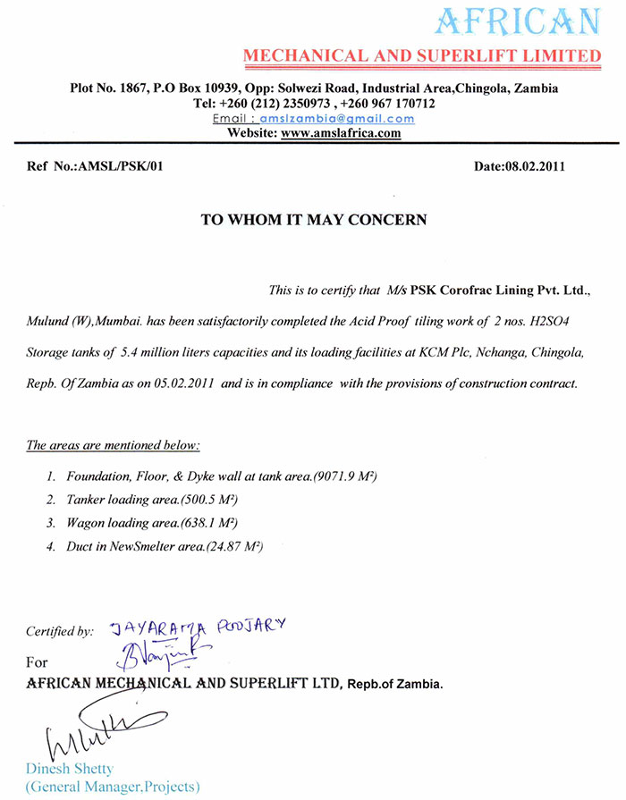 PSK Corofrac Linings Pvt. Ltd. is one of the market leaders in India which offers a complete solution to any industry for Acid Proof Brick / Tile Lining, Epoxy floorings & Refractory linings .We execute turnkey projects including design and installation for a plethora of industries in India & Overseas. For nearly three decades we have provided quality products and world class comprehensive construction services headed by multifunctional team in Acid Resistant Tile/Brick Linings, Carbon Brick Linings, Heavy duty Epoxy / PU Self Leveling floorings, Abrasion / Anticorrosive floor coatings, Anti fungal Wall Coatings and Refractory Linings. Other than many reputed projects executed in India, we have broadened our market base internationally and have exported and executed Projects in Dubai, Saudi Arabia, Zambia, Jordan, Phillipines & D.R.Congo. PSK has the capability to deliver complete & customized solutions for every industry by selection of appropriate material and proper design for Installation. Our detailed knowledge of Processing Conditions, Careful Planning & Design and latest Installation Techniques assure our clients durable & therefore cost effective facilities.